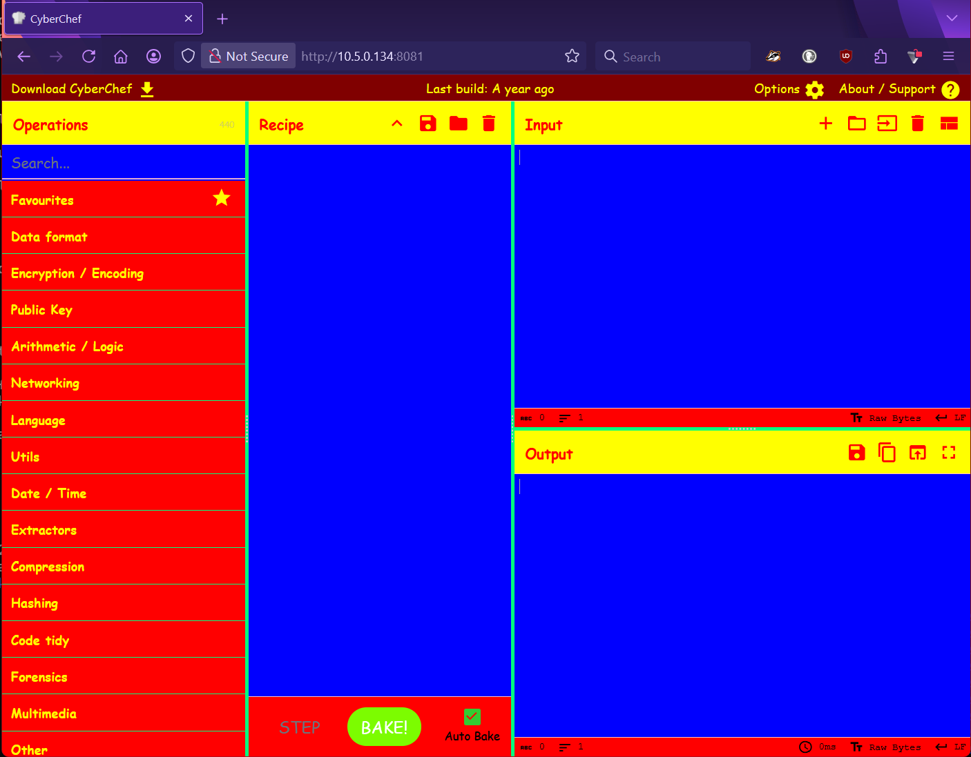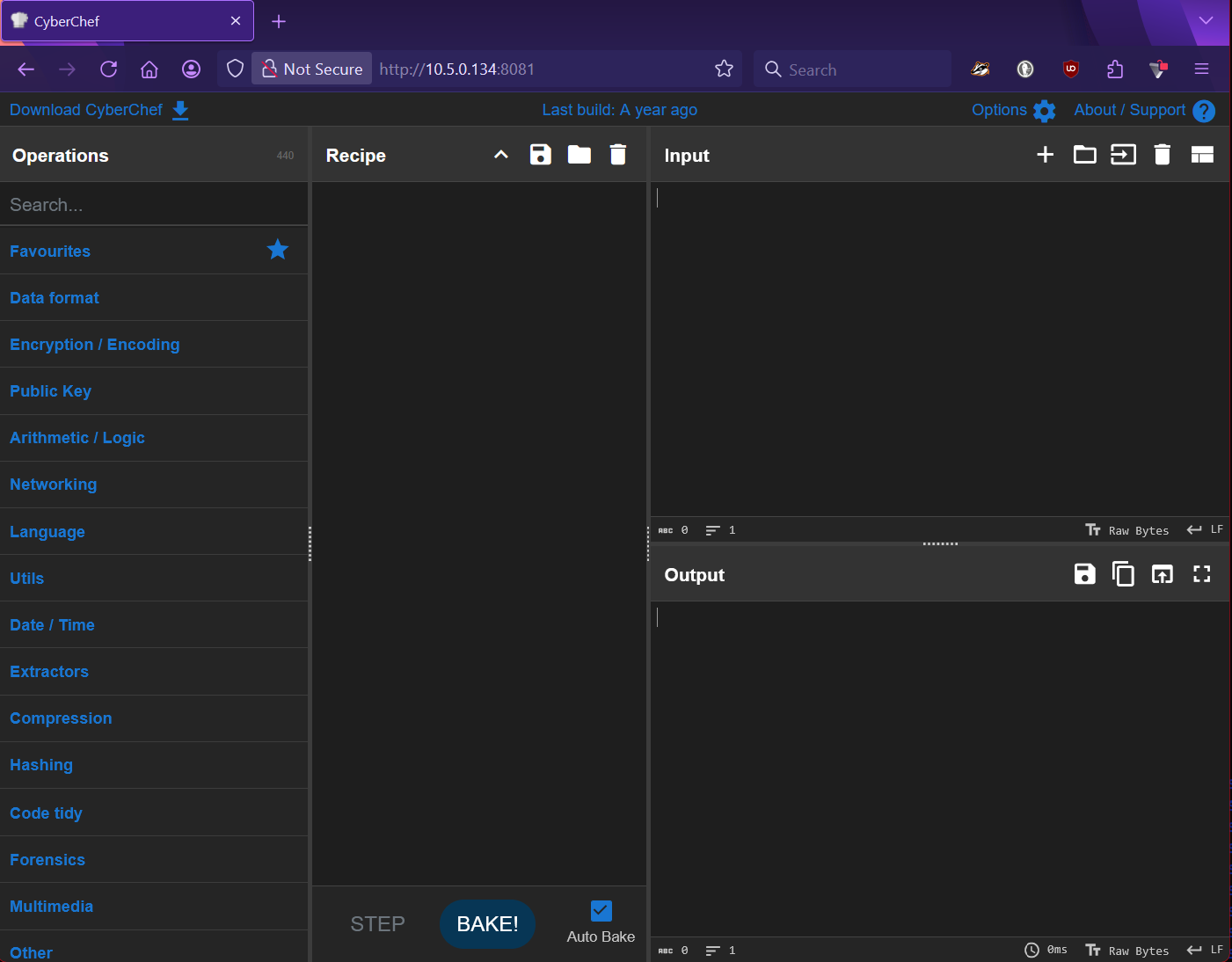 techfossa@techfossa-demo-01:/data/dockerdata/cyberchef$Your own cyber Swiss army knife should be available by entering it's URL in your browser, in this case for our server http://10.5.0.134:8081/