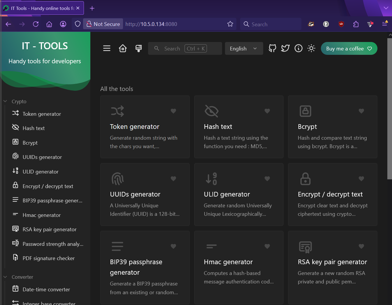 ✔ Container it-tools Started 0.3sCheck out your self hosted collection of handy IT Tools by entering it's URL in your browser, in this case for our server http://10.5.0.134:8080
